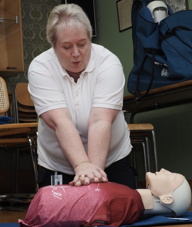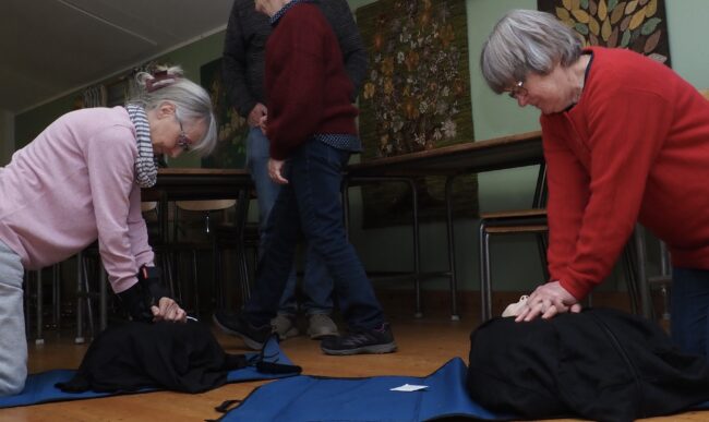 Efter fikat följde den mer handfasta delen av kvällen. Nu skulle vi parvis träna hjärt- och lungräddning på våra provdockor. Susanne visade hur och var på bröstkorgen man ska trycka och sen fick vi prova att köra två minuter i sträck, vilket var ganska ansträngande.